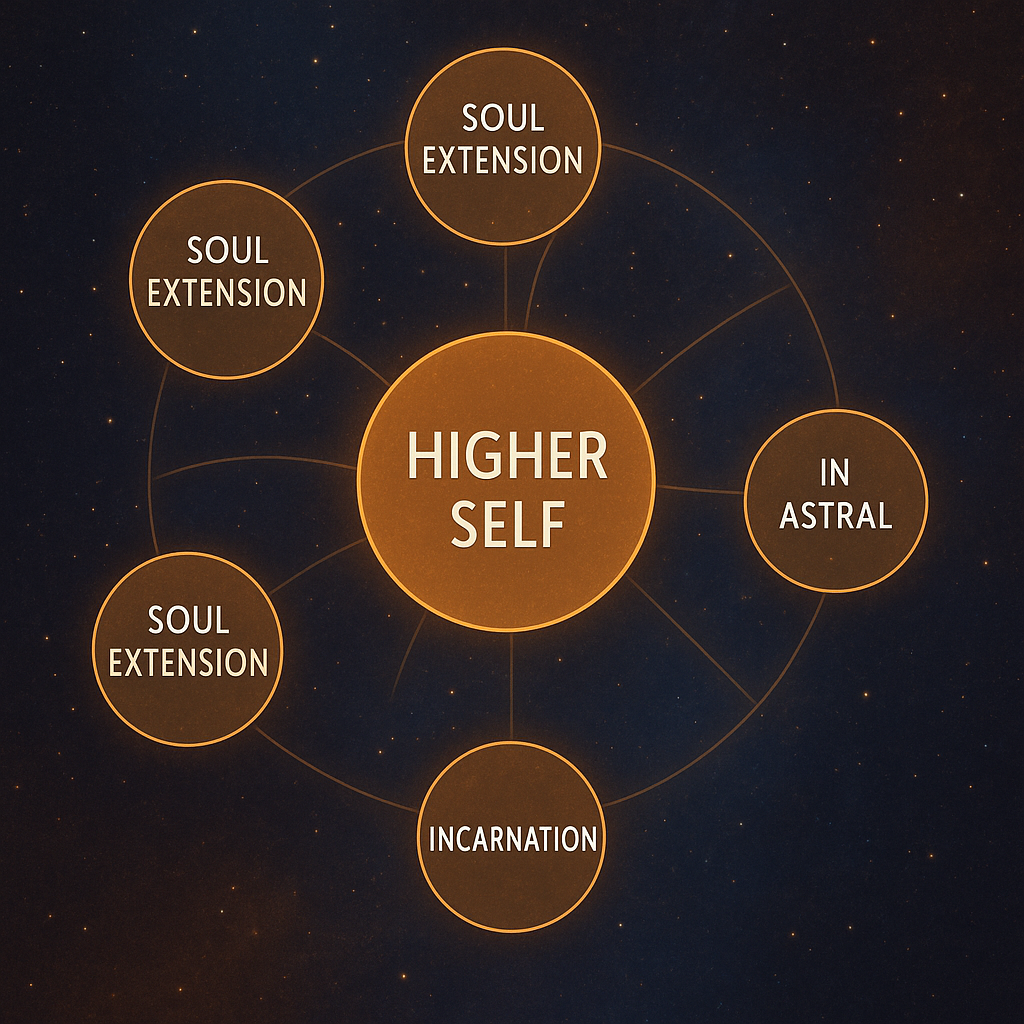 Think of the Higher Self as a great radiant sphere of consciousness, capable of extending many aspects of itself into incarnation at once. Each extension becomes what we call the incarnated soul (fractal aspect), living its life, exploring lessons, and gathering perspectives.